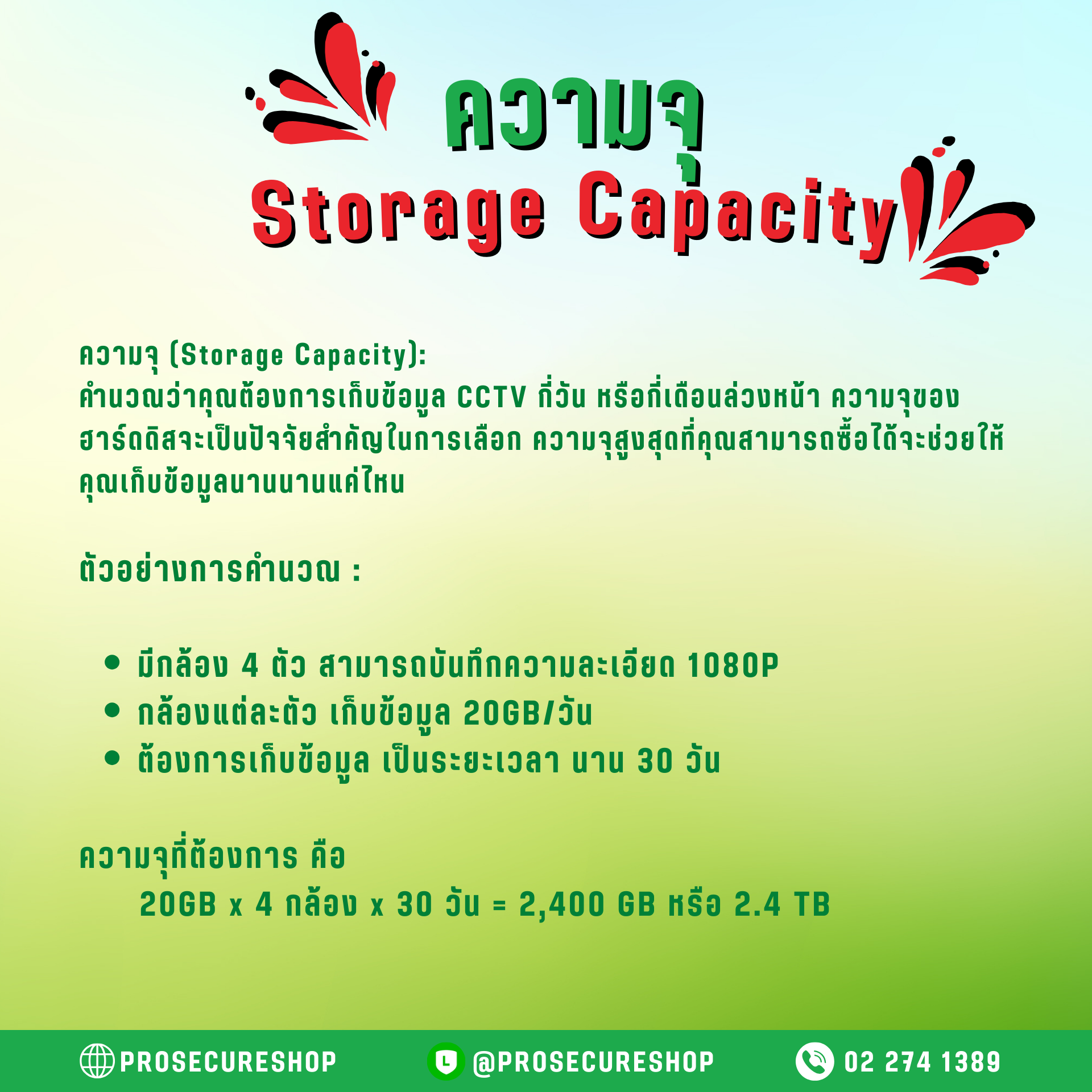 1.ความจุ (Storage Capacity): คำนวณว่าคุณต้องการเก็บข้อมูล CCTV กี่วัน หรือกี่เดือนล่วงหน้า ความจุของฮาร์ดดิสจะเป็นปัจจัยสำคัญในการเลือก ความจุสูงสุดที่คุณสามารถซื้อได้จะช่วยให้คุณเก็บข้อมูลนานนานแค่ไหน