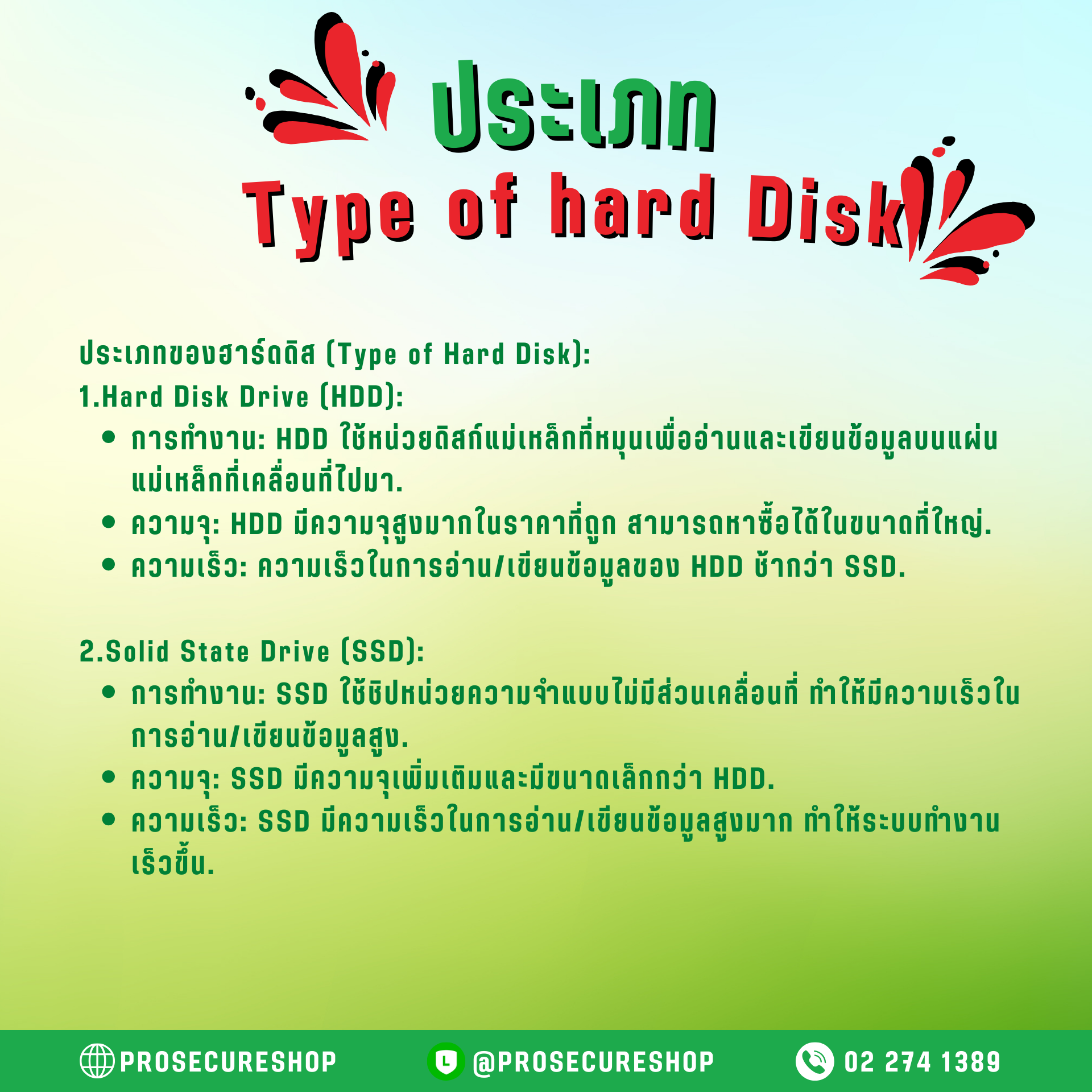 2.ประเภทของฮาร์ดดิส (Type of Hard Disk): คุณมีตัวเลือกหลายประเภทของฮาร์ดดิส เช่น Hard Disk Drive (HDD) หรือ Solid State Drive (SSD) แต่ละประเภทมีข้อดีและข้อเสียของตนเอง SSD มีความเร็วในการอ่าน/เขียนข้อมูลสูงกว่าแต่มีราคาสูงกว่า HDD