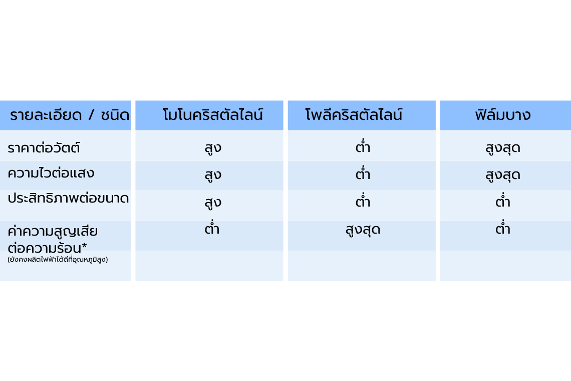 ตารางเปรียบเทียบคุณสมบัติของแผงชนิดต่างๆ