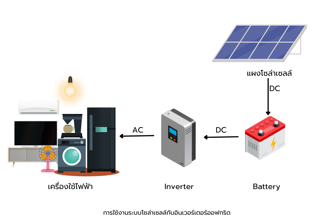 2.ออฟกริด อินเวอร์เตอร์ (Off Grid Inverter) หรือ แบบอิสระ (Stand Alone) เป็นระบบโซล่าเซลล์ที่ไม่เชื่อมต่อกับการไฟฟ้า โดยจะมีผลิตกระแสไฟฟ้าแล้วใช้ได้เลยทันทีในตอนกลางวัน และที่เหลือจะมีการสำรองไว้ในแบตเตอรี่ไว้ใช้ในตอนกลางคืน (หรือเรียกว่าเป็นระบบ Stand Alone ) ไม่ต้องขออนุญาตจากการไฟฟ้า