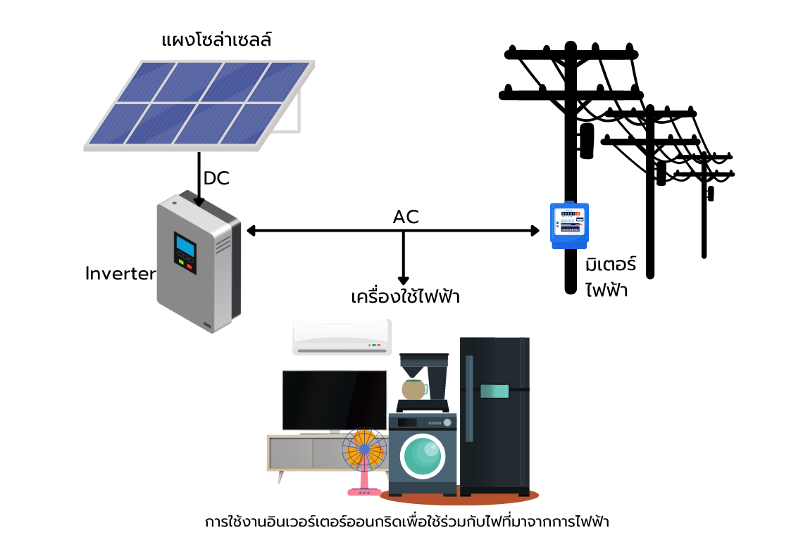 1.ออนกริด อินเวอร์เตอร์  (On Grid  inverter) หรือ อินเวอร์เตอร์ชนิดนี้มีไว้สำหรับเชื่อมต่อเข้ากับระบบไฟฟ้าภายในบ้าน (ขนานไฟฟ้า) เพื่อนำไฟฟ้าที่ผลิตได้จากแผงโซล่าเซลล์ไปจ่ายให้กับอุปกรณ์ไฟฟ้าทั่วไป โดยต้องใช้งานร่วมกับไฟฟ้าที่รับมาจากการไฟฟ้าเสมอ