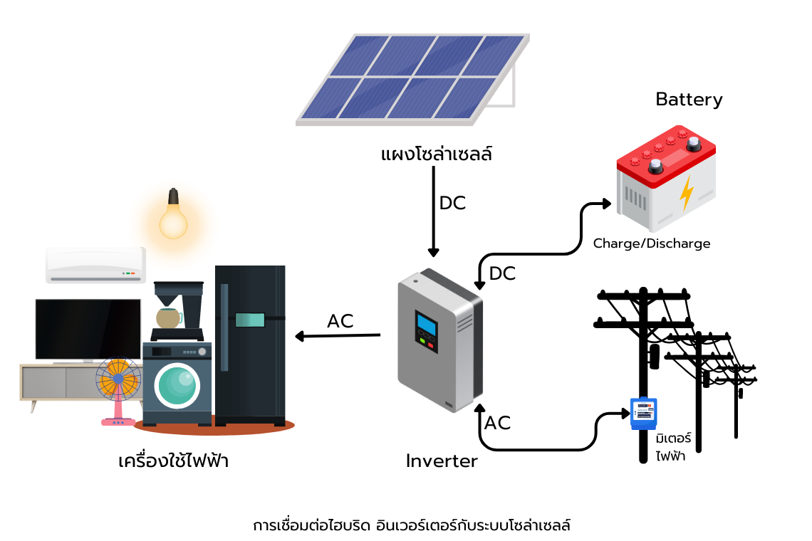 3.ไฮบริด อินเวอร์เตอร์ (Hybrid inverter) อินเวอร์เตอร์ชนิดนี้เป็นลูกผสมระหว่างอินเวอร์เตอร์แบบออนกริด และ ออฟกริด โดยเป็นอินเวอร์เตอร์ที่ผลิตขึ้นเพื่อให้มีความสามารถรวมข้อดีของอินเวอร์เตอร์ทั้งสองประเภท คือความสามารถในการเชื่อมต่อกับระบบไฟฟ้าภายในบ้านหรือระบบไฟฟ้าที่มาจากการไฟฟ้า เหมือนอินเวอร์เตอร์แบบออนกริด การนำพลังงานไฟฟ้าที่ถูกกักเก็บในแบตเตอรี่มาจ่ายให้กับเครื่องใช้ไฟฟ้าเหมือนอินเวอร์เตอร์แบบ ออฟกริด นอกจากนี้อินเวอร์เตอร์แบบ Hybrid ยังมีการรวมเอาความสามารถในการควบคุมการชาร์จไฟหรือกักเก็บพลังงานลงในแบตเตอรี่ (Charge controller) ไว้ในตัวอุปกรณ์ด้วยเลย และยังอาจมีความสามารถเพิ่มเติม เช่น การจ่ายไฟจากแบตเตอรี่ทดแทนเฉพาะบางส่วนของบ้านเมื่อไฟฟ้าดับ การตั้งลำดับความสำคัญ (priority)ว่าจะให้ไฟจากแผงโซลาร์เซลล์ชาร์จลงแบตเตอรี่จนเต็มก่อน หรือจะจ่ายเข้าบ้านเพื่อลดค่าไฟฟ้าก่อน เป็นต้น