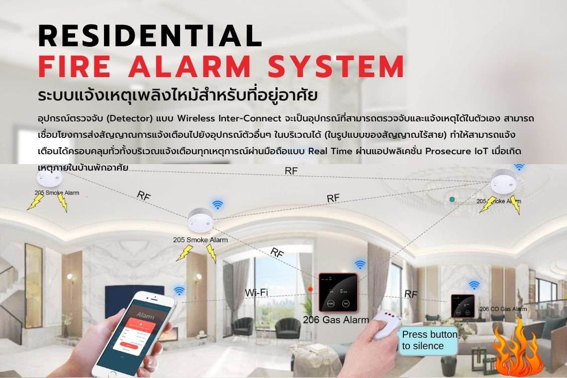 อุปกรณ์ตรวจจับ (Detector) แบบ Wireless Inter-Connect จะเป็นอุปกรณ์ที่สามารถตรวจจับและแจ้งเหตุได้ในตัวเอง สามารถเชื่อมโยงการส่งสัญญาณการแจ้งเตือนไปยังอุปกรณ์ตัวอื่นๆ ในบริเวณได้ (ในรูปแบบของสัญญาณไร้สาย) ทำให้สามารถแจ้งเตือนได้ครอบคลุมทั่วทั้งบริเวณแจ้งเตือนทุกเหตุการณ์ผ่านมือถือแบบ Real Time ผ่านแอปพลิเคชั่น Prosecure IoT เมื่อเกิดเหตุภายในบ้านพักอาศัย
